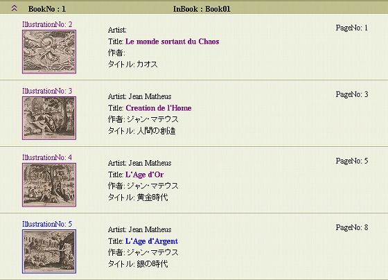 本のタイトルを選択すると、その本の情報が表示され、本に含まれる全ての挿絵の一覧が参照可能です。