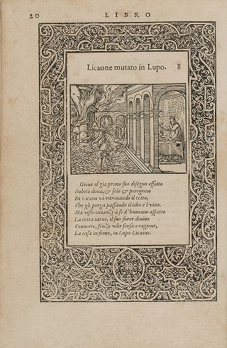 Lycaon changed into a wolf: Jupiter changes Lycaon into a wolf as punishment for offering the god, who is sitting at table, human flesh to eat; Lycaon's house is struck with lightning (Ovid, Metamorphoses I 237)