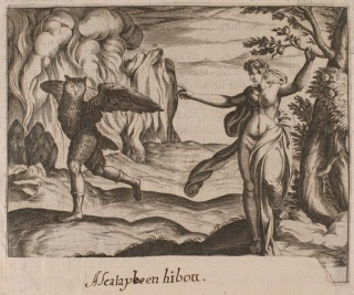 Ascalaphus changed into a screech-owl: as punishment for discovering she had eaten some pomegranates, Proserpina sprinkles water from the Phlegethon on Ascalaphus' head, thus changing him into a screech-owl (Ovid, Metamorphoses V 543)