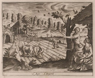 the silver age, 'Aetas argentea'; men plough the soil and build huts