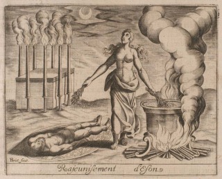 Aeson is laid down before Medea; she brews a potion in a bronze pot (an old and dry olive-branch becomes green when stirred in it)