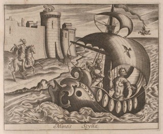 Scylla changed into a lark: when falling from Minos' boat (or when throwing herself into the sea), Scylla, daughter of Nisus, is changed into a lark; she is then pursued by the hawk into which her father was transformed (Ovid, Metamorphoses VIII 145)
