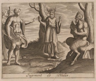 contest between Apollo and Pan with the mountain god Tmolus as judge, i.e. judgement of Midas; Midas often represented with ass's ears